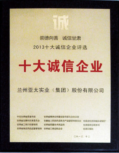 兰州k8凯发天生赢家一触即发股份公司荣获2013“甘肃十大诚信企业”称呼